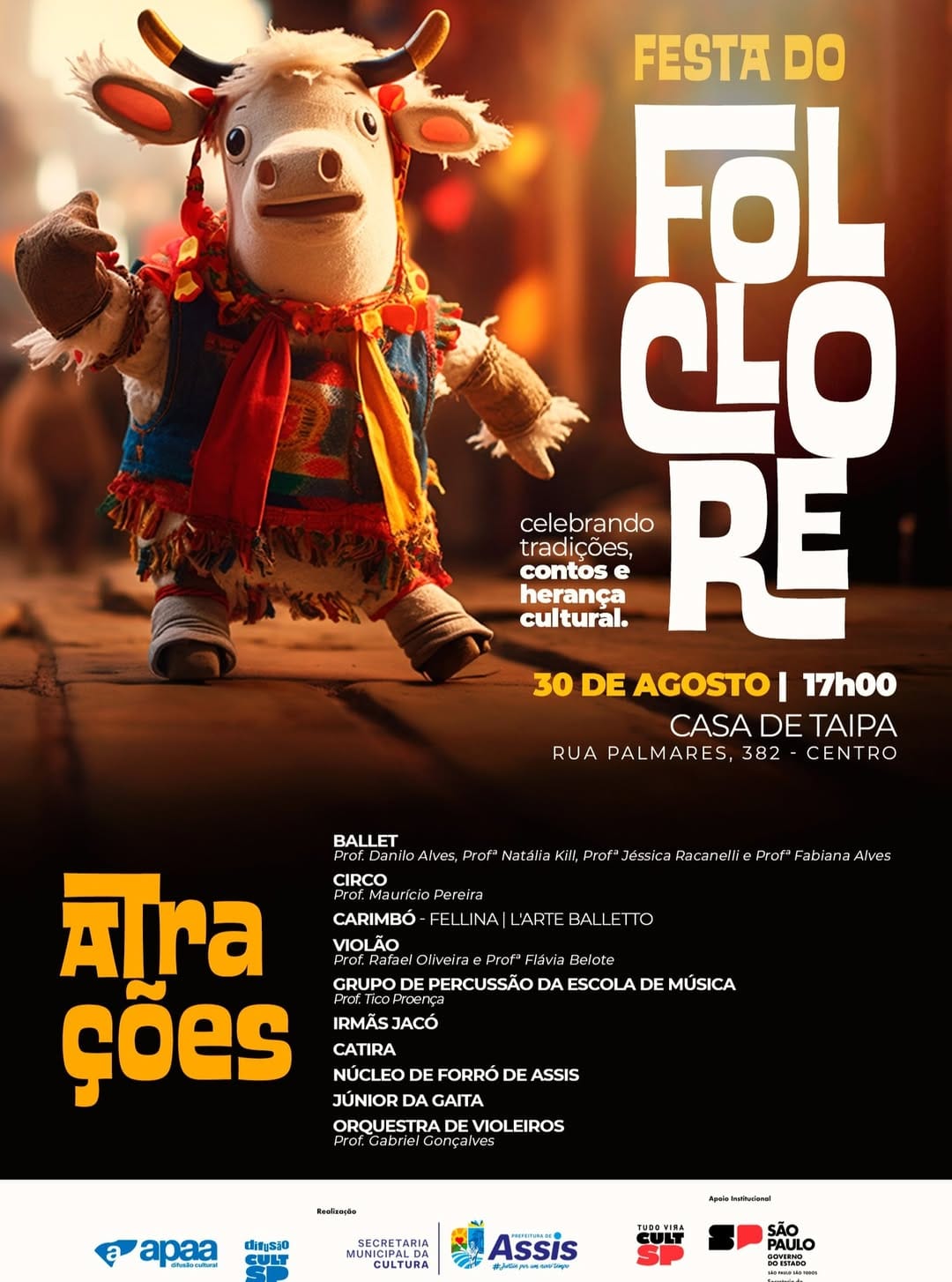 A Festa do Folclore na Casa de Taipa é uma oportunidade única para celebrar as raízesculturais de Assis, promover o turismo e valorizar a arte popular em suas mais variadasformas. Todos estão convidados a participar deste momento de encontro, tradição e alegria.